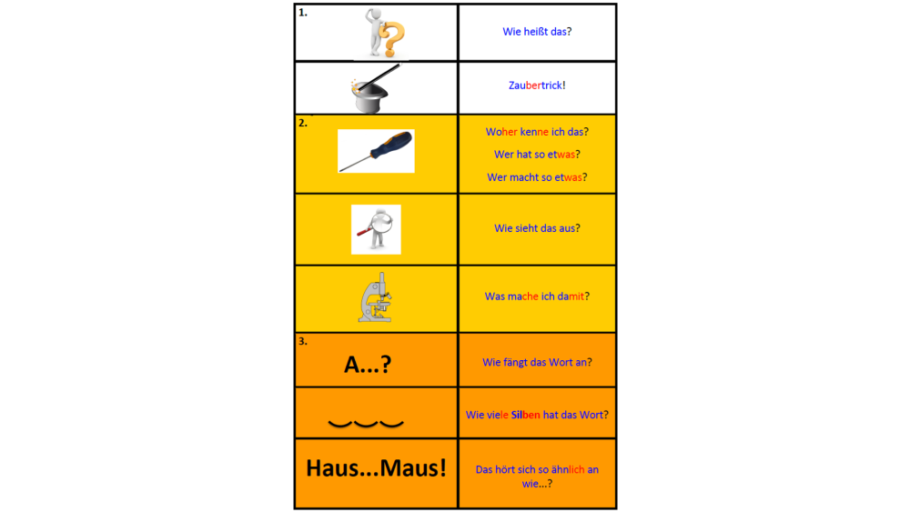 Mit Hilfe dieser (Frage-)Strategien können Kinder genau den Teil des lexikalischen Wissens erfragen, der ihnen noch fehlt. Ist dem Kind die Funktion eines Gegenstandes zwar bekannt, sie:er kann das entsprechende Wort aber nicht benennen, so fragt sie:er nach der Wortform (z. B. „Wie heißt das?“, „Was ist das?“). Der Zaubertrick zielt auf eine verbesserte Abspeicherung der bislang unbekannten Wortform im mentalen Lexikon ab, z. B. indem die Silben des Wortes mehrmals geschwungen oder gehüpft werden.