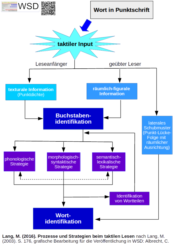 Auch beim taktilen Lesen kann davon ausgegangen werden, dass sowohl eine phonologische Route, die Aufnahme einzelner Punktschriftzeichen und eine darauffolgende Graphem-Phonem-Zuordnung , als auch eine lexikalische Route für das Lesen von Wörtern Verwendung findet.