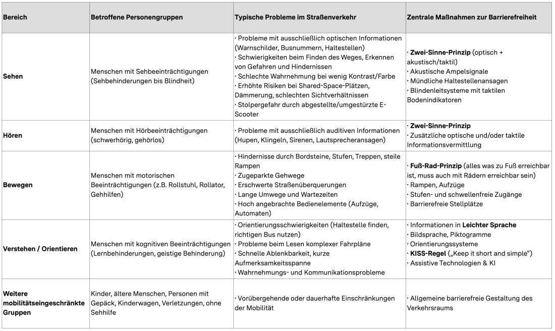 Die folgende Übersicht stellt anhand dieser Personengruppen typische Probleme im Straßenverkehr und mögliche Maßnahmen zur Barrierefreiheit dar: