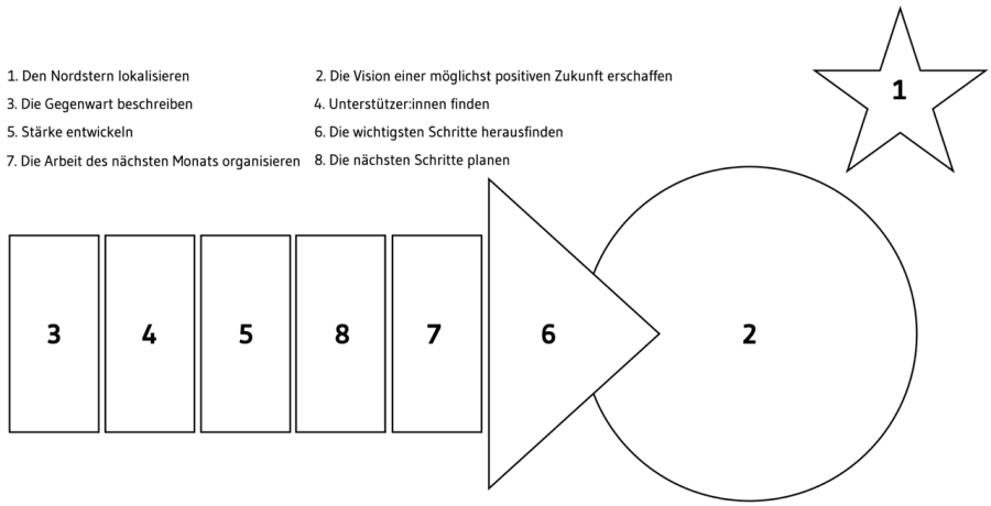 Der Planungsprozess startet nach der Begrüßung mit dem Finden des „persönlichen Nordsterns“ (1). Der „persönliche Nordstern“ steht stellvertretend für das, was die Hauptperson im Leben leitet, ihre Werte, Ziele und Ideale. Dieser Schritt soll dem Unterstützer:innenkreis ermöglichen zu verstehen, was der planenden Person in ihrem Leben wichtig ist (vgl. Doose 2020, 193).